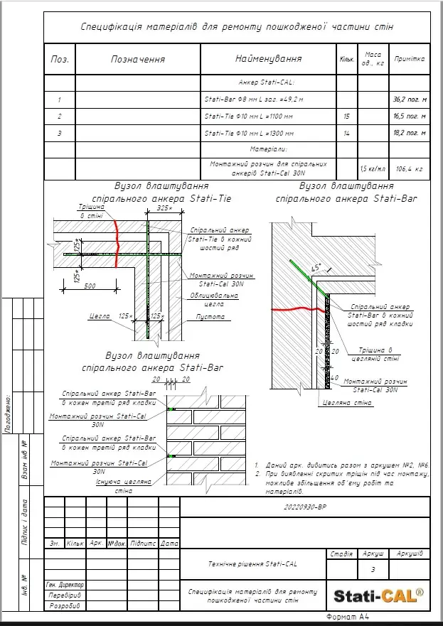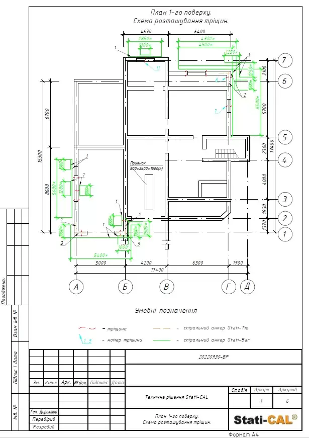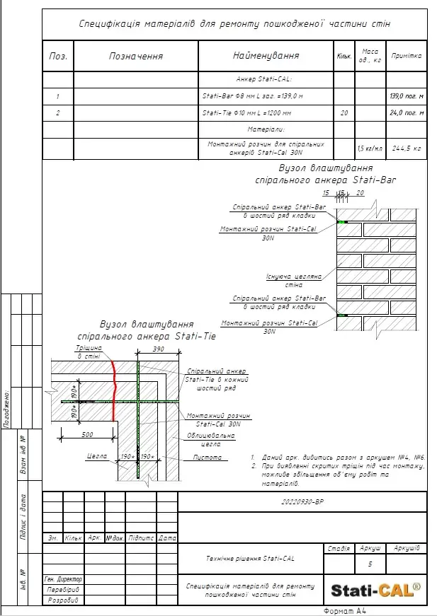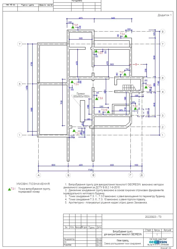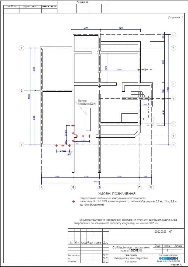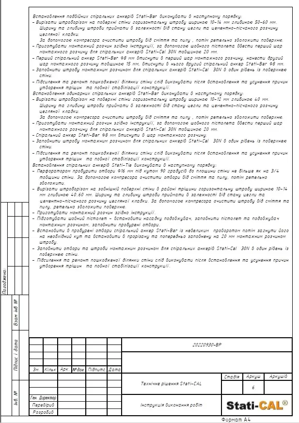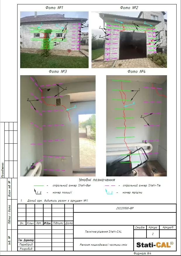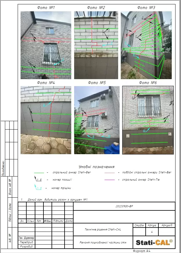 Based on the results of the house survey and the report on dynamic probing, a preliminary project was developed for the work on strengthening the foundation under a part of the house using Georesin technology, repairing cracks in load-bearing walls, and strengthening walls using Stati-Bar/Stati-Tie prestressed reinforcement technology based on which the volume and cost of work were calculated (project below in the materials). The project and commercial proposal were coordinated with the homeowner.