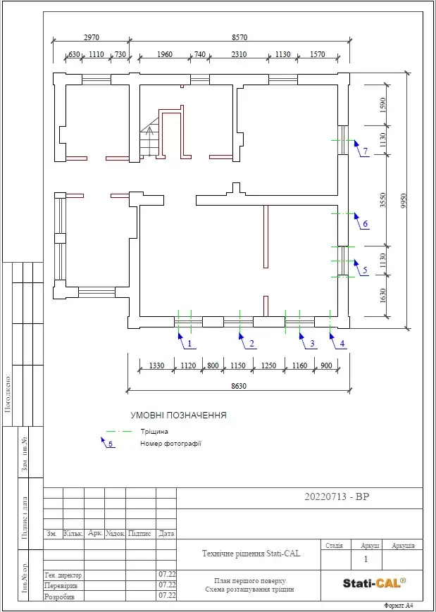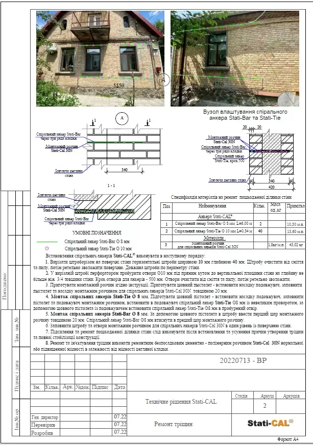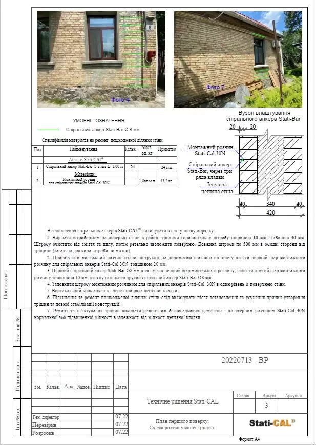 Фахівцями ТОВ «Статичні Системи» було проведено огляд будівлі. Інженером було розроблено проект ремонту, прорахована вартість робіт, а також погоджена комерційна пропозиція з домовласником.