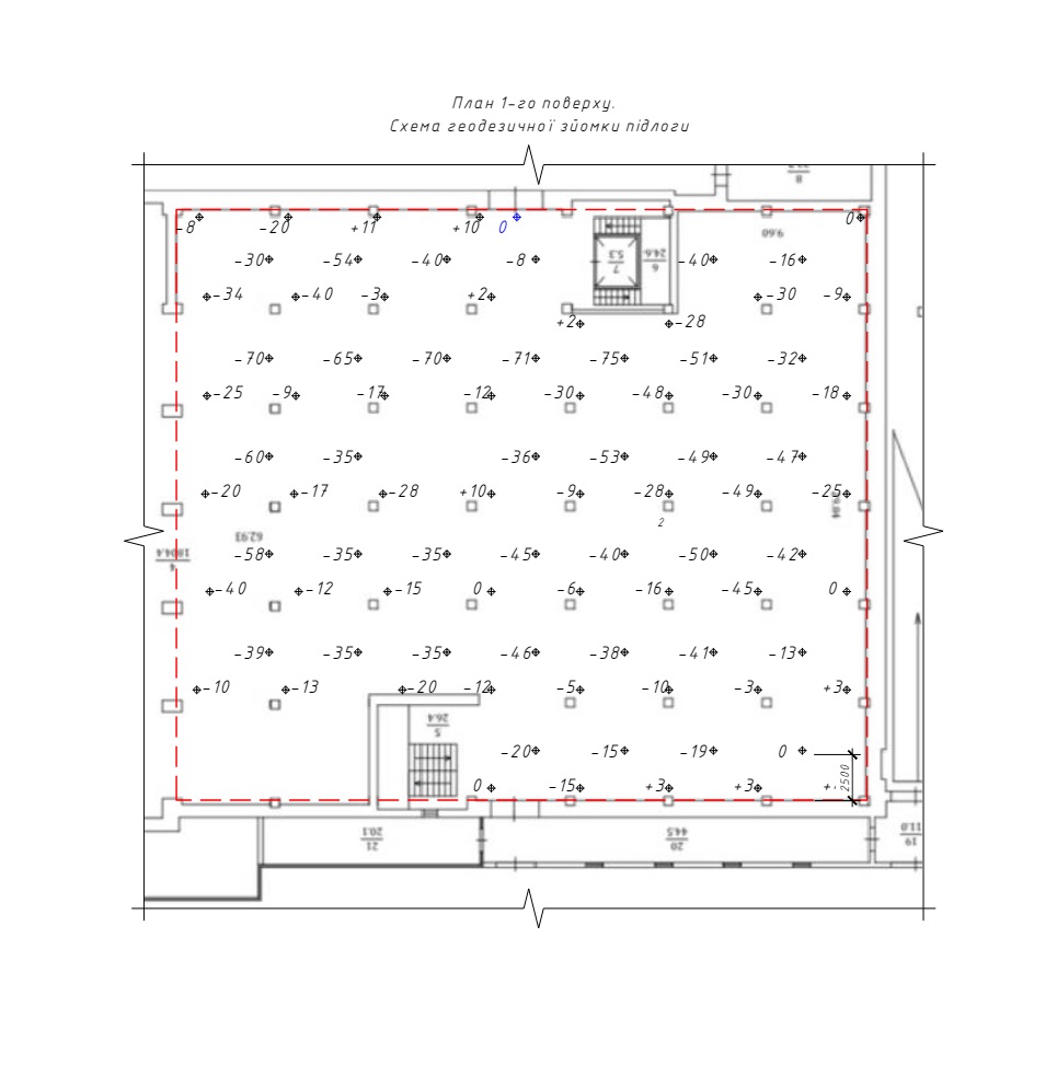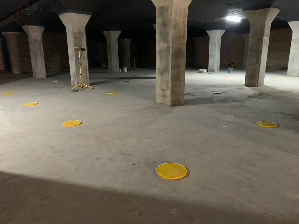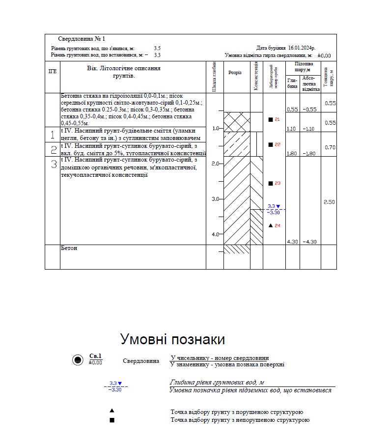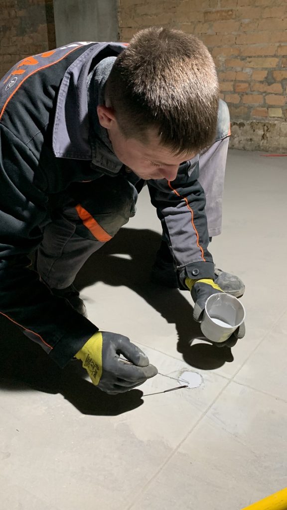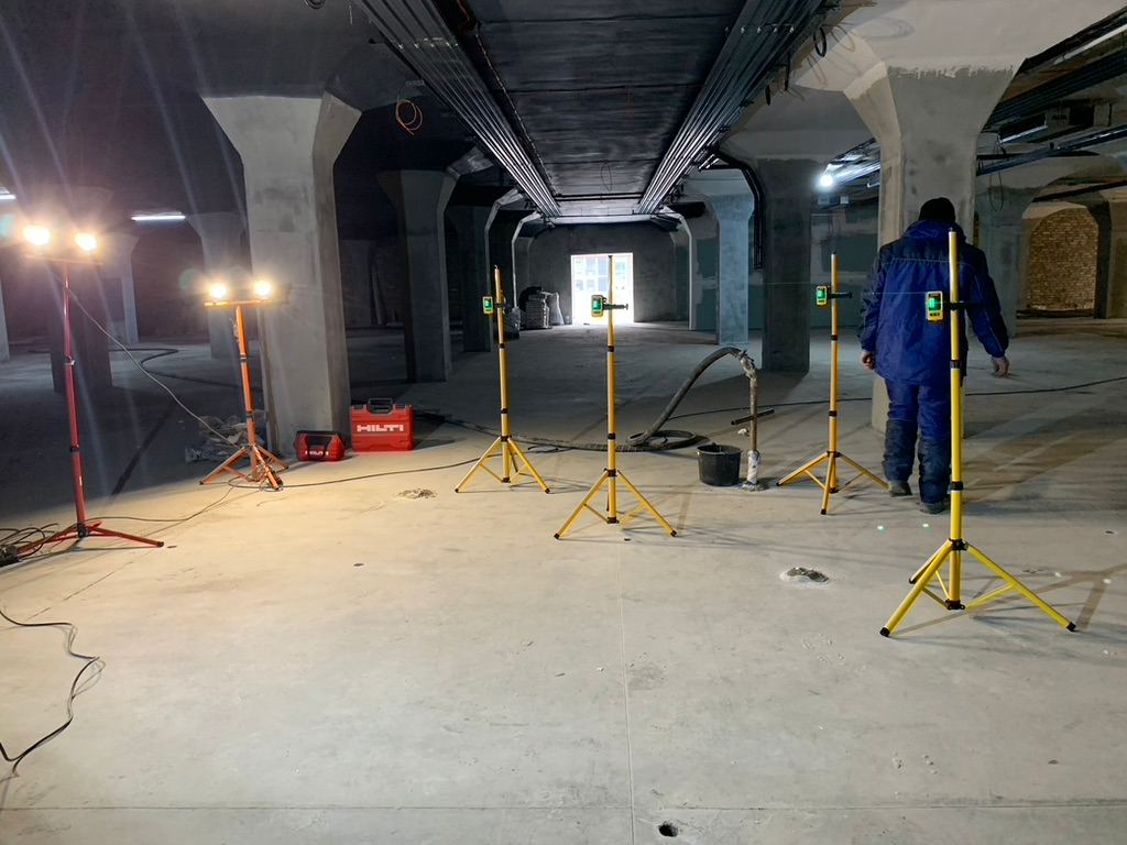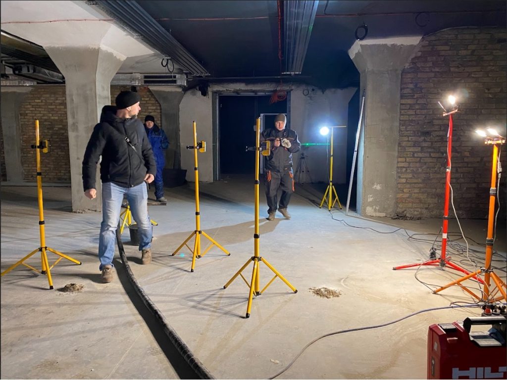 Методом динамічного зондування обстежено основу (ґрунт) фундаменту й плити підлоги, безпосередньо сам фундамент, ділянки стін із тріщинами. Виконано геодезичну зйомку рівності плити підлоги відносно проєктних відміток. За результатами досліджень і обстеження підготовлено технічний звіт (ТЗ) з висновками та рекомендаціями.