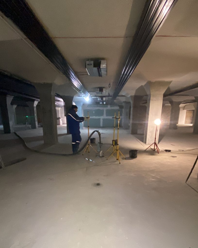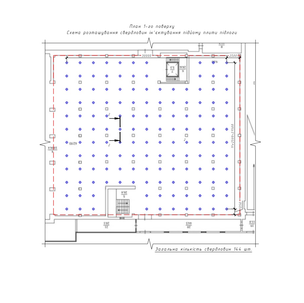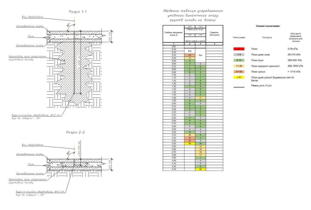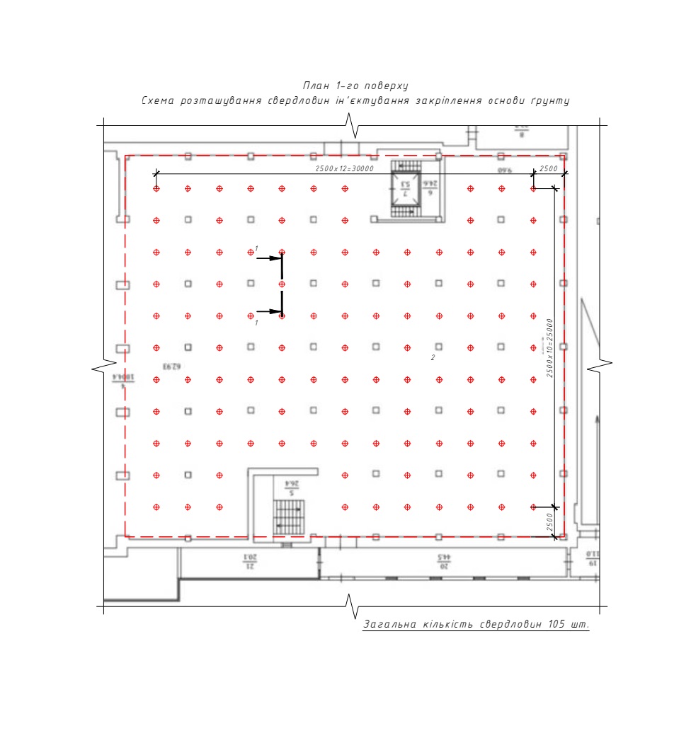- Укріпити основу (ґрунт) залізобетонної плити підлоги на глибину до 4,0 м від верху плити підлоги методом ін’єктування гелеокомпозитних розчинів на основі цементних сумішей.