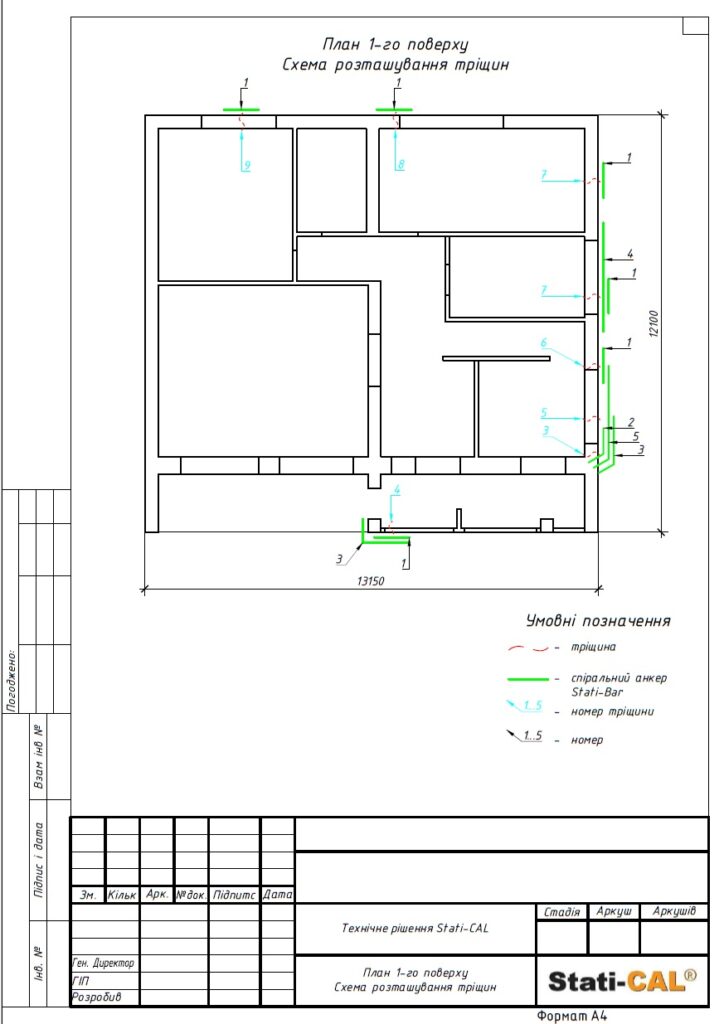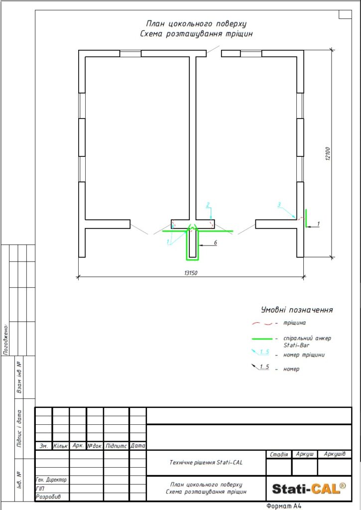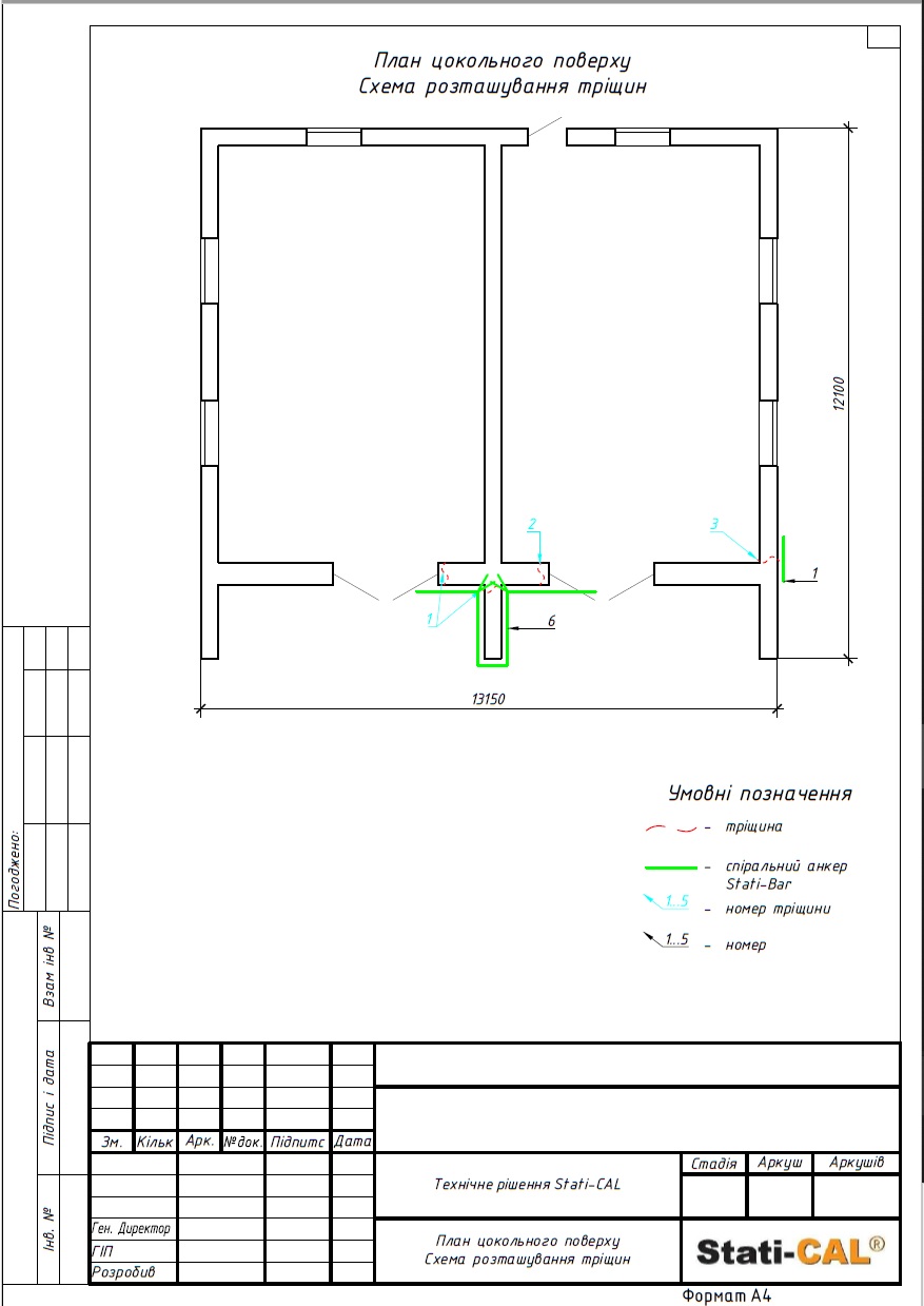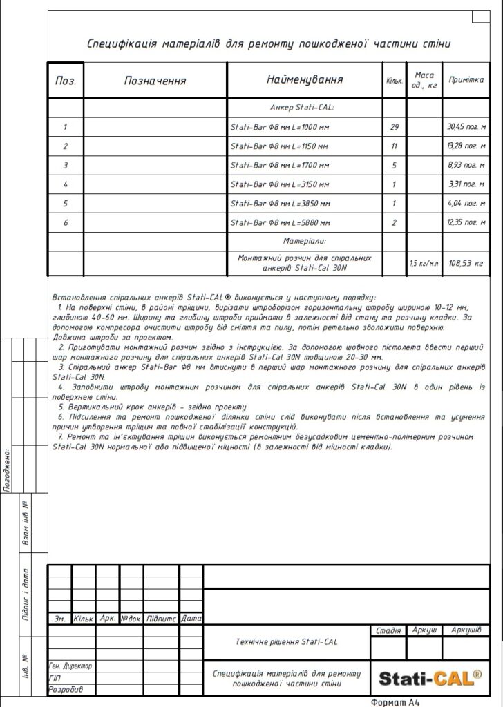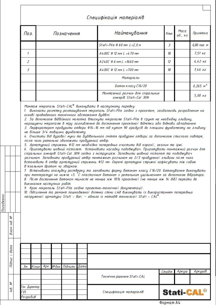 С учетом выявленных проблем инженеры ООО «Статичные Системы» разработали детальный проект работ с целью усиления фундамента и опорных стен здания. По технологии Stati-Pile было установлено 3 сваи длиной по 2 м и диаметром 60 мм. Согласно методике Stati-BAR, были восстановлены поврежденные части стен обоих этажей с помощью арматуры диаметром 8 мм общей длиной 100 м.